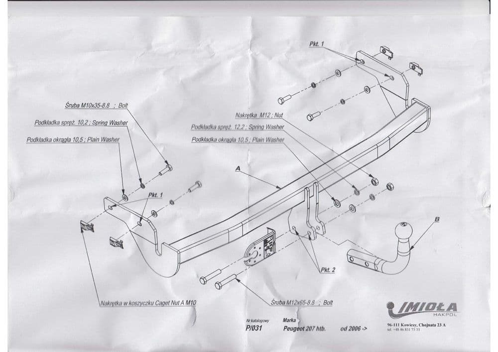 Польский фаркоп Imiola с условно съемным крюком на 2-х болтах (тип шара A), вырез в бампере при установке нужен, электрика приобретается отдельно, максимально разрешенная масса прицепа 1150 кг.