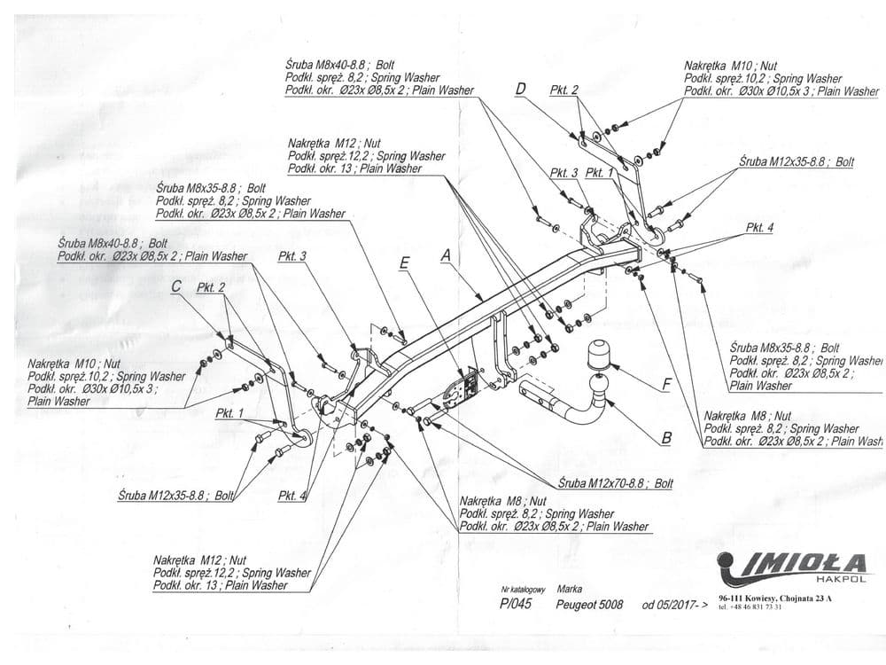 Польский фаркоп Imiola с условно съемным крюком на 2-х болтах (тип шара A), вырез в бампере при установке не нужен, электрика приобретается отдельно, максимально разрешенная масса прицепа 1400 кг.
