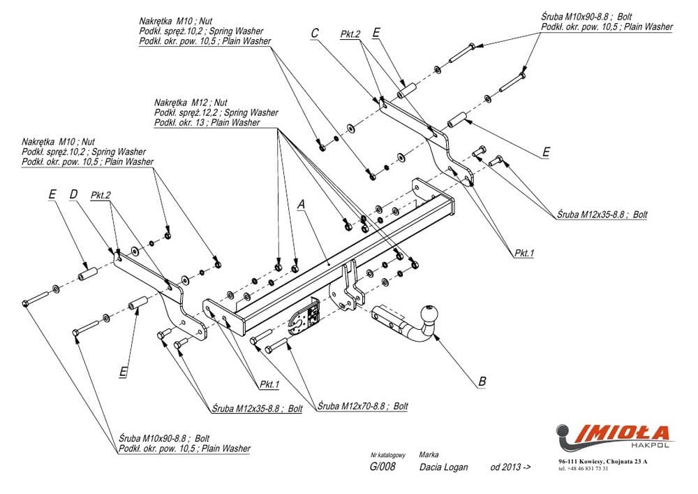 Польский фаркоп Imiola с условно съемным крюком на 2-х болтах (тип шара A), вырез в бампере при установке не нужен, электрика приобретается отдельно, максимально разрешенная масса прицепа 1350 кг.
