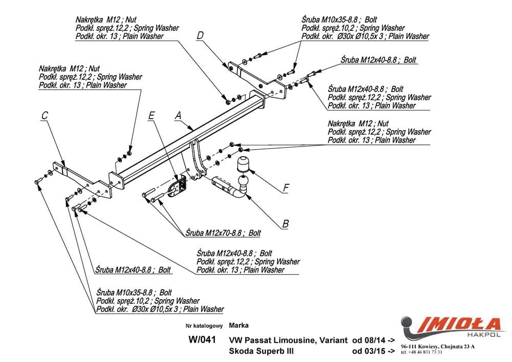 Польский фаркоп Imiola с условно съемным крюком на 2-х болтах (тип шара A), вырез в бампере при установке нужен, электрика приобретается отдельно, максимально разрешенная масса прицепа 2235 кг.