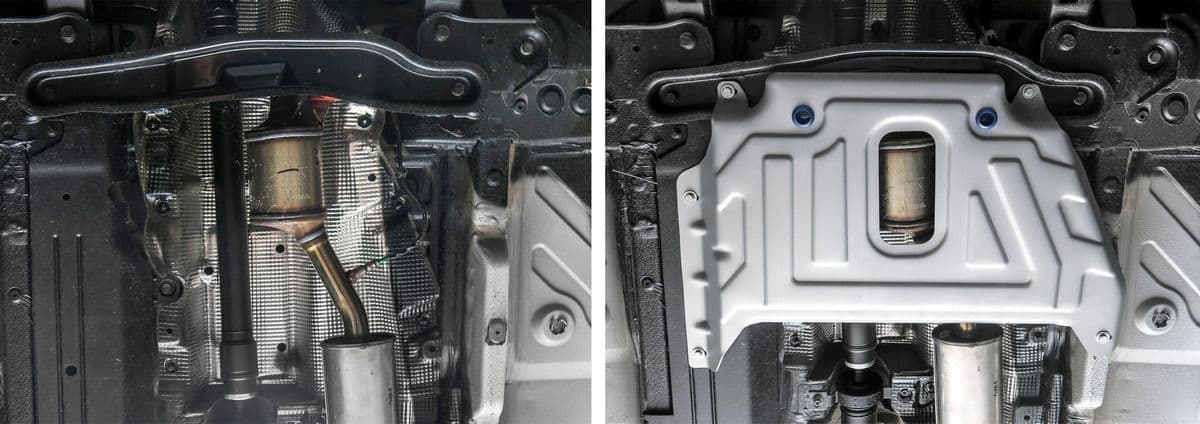 Стойкое порошковое окрашивание позволяет сохранить внешний вид, защитит от царапин, предотвратит коррозию. Также имеется утопленный крепеж для предотвращения срывов. Крепеж не образует с алюминием гальваническую пару. Защита спроектирована индивидуально для автомобиля, что позволяет устанавливать ее в штатные места без доработки кузова за 10 мин.