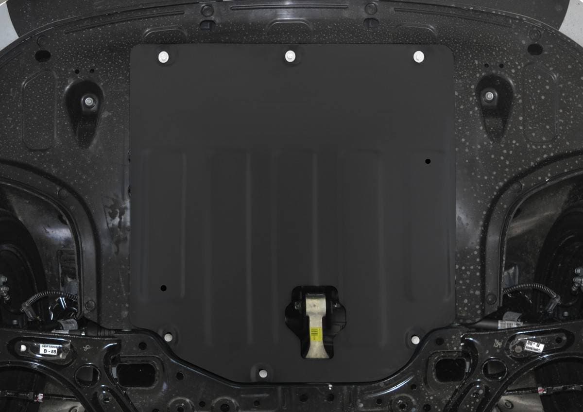 Порошковое окрашивание гарантирует долгий срок службы. А глубокий штамп увеличивает жесткость до 2,5 раз. Также имеется утопленный крепеж для предотвращения срывов. Качественная покраска защиты картера выдерживает 720 часов соляного тумана. Толщина изделия составляет 2-6 мм. Подштамповка в местах крепления предохраняет крепеж от срезания. Деталь спроектирована индивидуально для вашего автомобиля, что позволяет устанавливать ее в штатные места без доработки кузова за 10 мин.