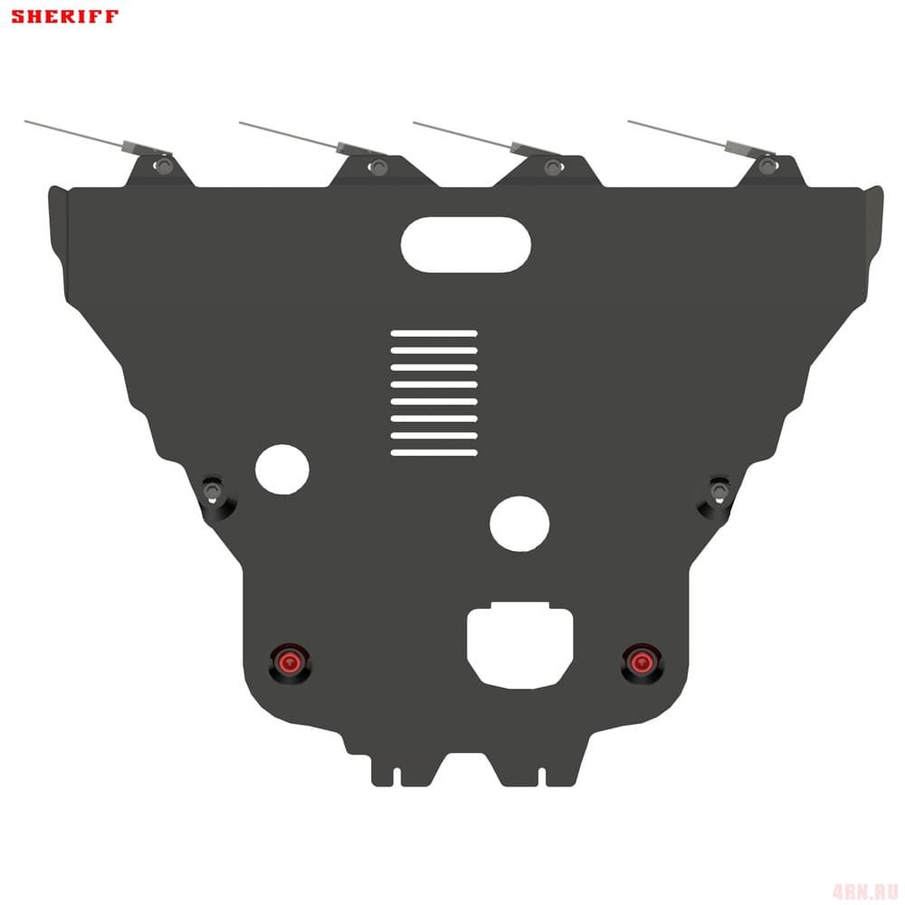 Защита картера Sheriff нужна для сохранности узлов и агрегатов, находящихся на днище авто. Она надежно защитит двигательный отсек вашей машины от повреждений. Также она защищает моторный отсек от влаги, грязи, и предусматривает наличие металлических крыльев, которые выполняют функцию пыльника.