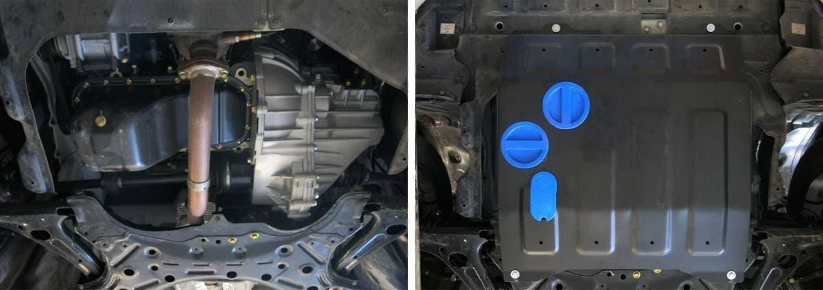 Порошковое окрашивание гарантирует долгий срок службы. А глубокий штамп увеличивает жесткость до 2,5 раз. Также имеется утопленный крепеж для предотвращения срывов. Качественная покраска защиты картера выдерживает 720 часов соляного тумана. Толщина изделия составляет 2-6 мм. Подштамповка в местах крепления предохраняет крепеж от срезания. Деталь спроектирована индивидуально для вашего автомобиля, что позволяет устанавливать ее в штатные места без доработки кузова за 10 мин.