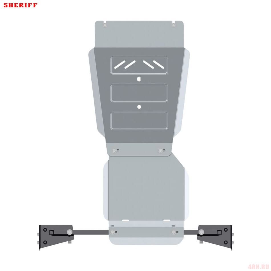 Алюминиевая защита кпп и раздаточной коробки с крепежом в комплекте, артикул 14.3423 от российского производителя Шериф. Разработана специально для автомобиля Митсубиси Паджеро Спорт 2016-2020.