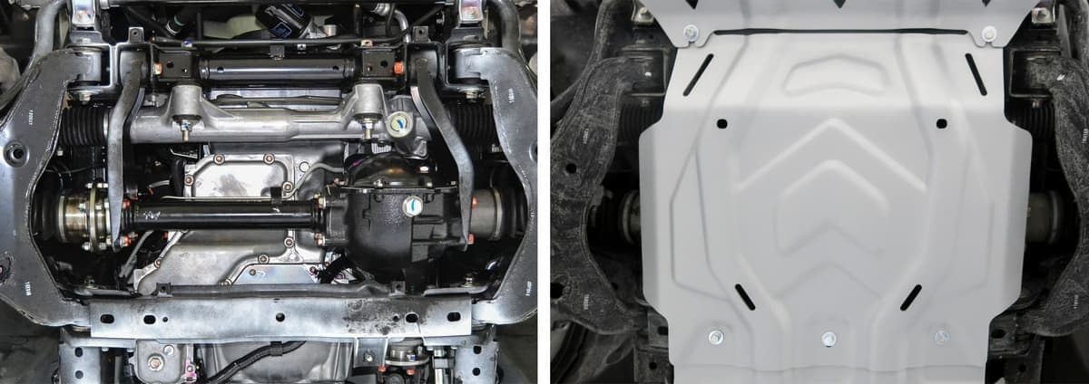 Стойкое порошковое окрашивание позволяет сохранить внешний вид, защитит от царапин, предотвратит коррозию. Также имеется утопленный крепеж для предотвращения срывов. Крепеж не образует с алюминием гальваническую пару. Защита спроектирована индивидуально для автомобиля, что позволяет устанавливать ее в штатные места без доработки кузова за 10 мин.