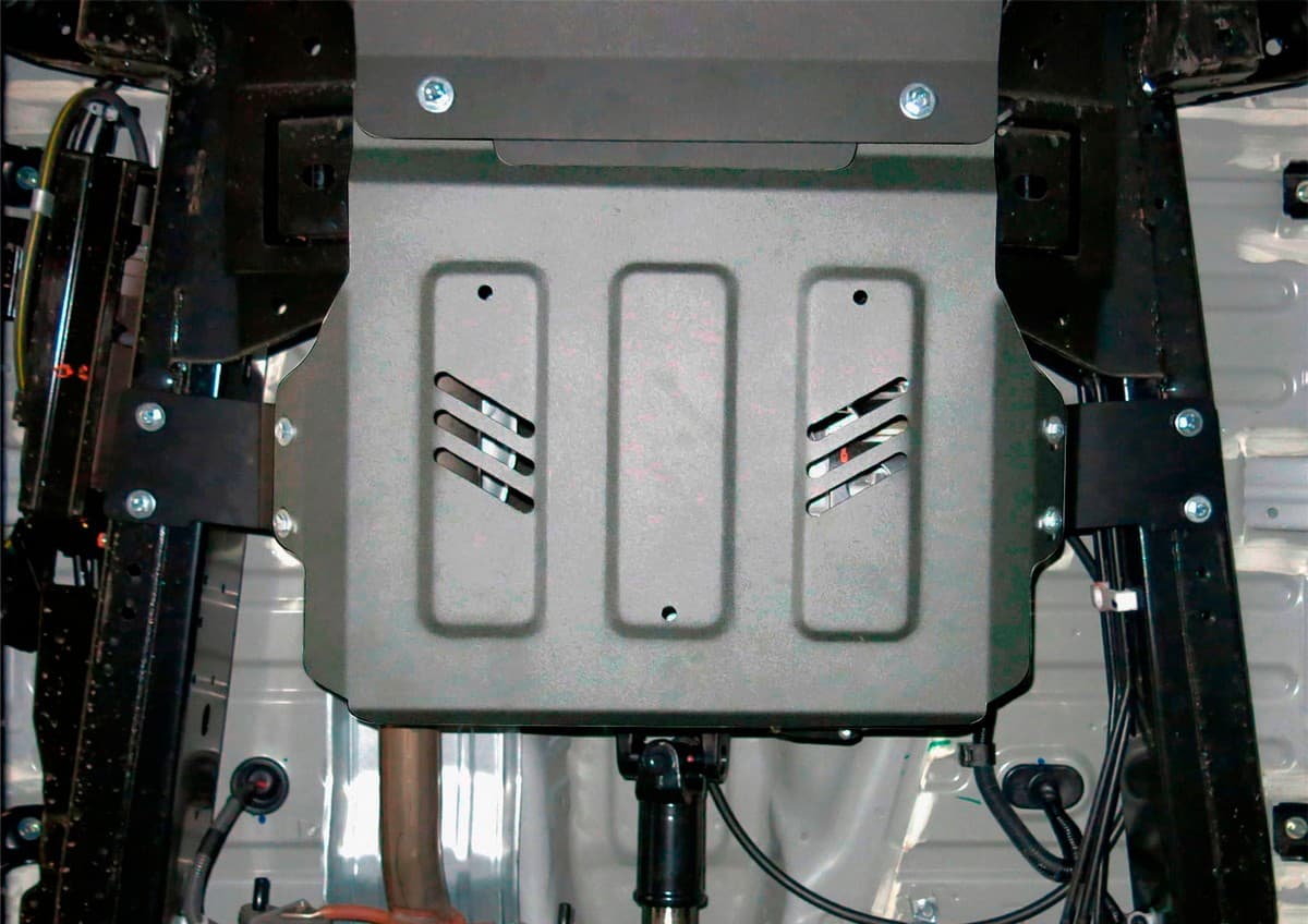 Стойкое порошковое окрашивание позволяет сохранить внешний вид, защитит от царапин, предотвратит коррозию. Также имеется утопленный крепеж для предотвращения срывов. Крепеж не образует с алюминием гальваническую пару. Защита спроектирована индивидуально для автомобиля, что позволяет устанавливать ее в штатные места без доработки кузова за 10 мин.