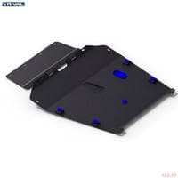 Порошковое окрашивание гарантирует долгий срок службы. А глубокий штамп увеличивает жесткость до 2,5 раз. Также имеется утопленный крепеж для предотвращения срывов. Качественная покраска защиты картера выдерживает 720 часов соляного тумана. Толщина изделия составляет 2-6 мм. Подштамповка в местах крепления предохраняет крепеж от срезания. Деталь спроектирована индивидуально для вашего автомобиля, что позволяет устанавливать ее в штатные места без доработки кузова за 10 мин.