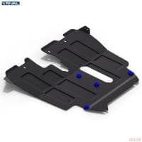 Порошковое окрашивание гарантирует долгий срок службы. А глубокий штамп увеличивает жесткость до 2,5 раз. Также имеется утопленный крепеж для предотвращения срывов. Качественная покраска защиты картера выдерживает 720 часов соляного тумана. Толщина изделия составляет 2-6 мм. Подштамповка в местах крепления предохраняет крепеж от срезания. Деталь спроектирована индивидуально для вашего автомобиля, что позволяет устанавливать ее в штатные места без доработки кузова за 10 мин.