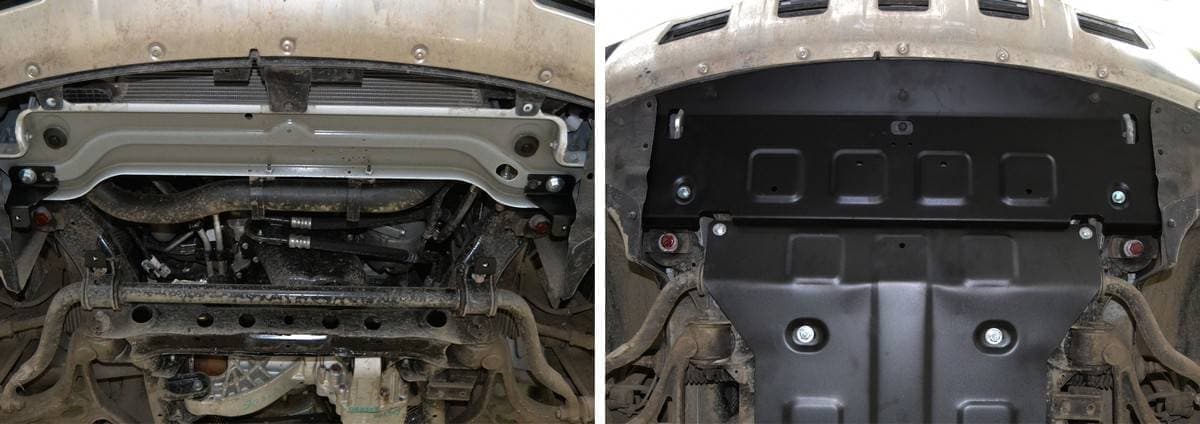 Порошковое окрашивание гарантирует долгий срок службы. А глубокий штамп увеличивает жесткость до 2,5 раз. Также имеется утопленный крепеж для предотвращения срывов. Качественная покраска защиты картера выдерживает 720 часов соляного тумана. Толщина изделия составляет 2-6 мм. Подштамповка в местах крепления предохраняет крепеж от срезания. Деталь спроектирована индивидуально для вашего автомобиля, что позволяет устанавливать ее в штатные места без доработки кузова за 10 мин.