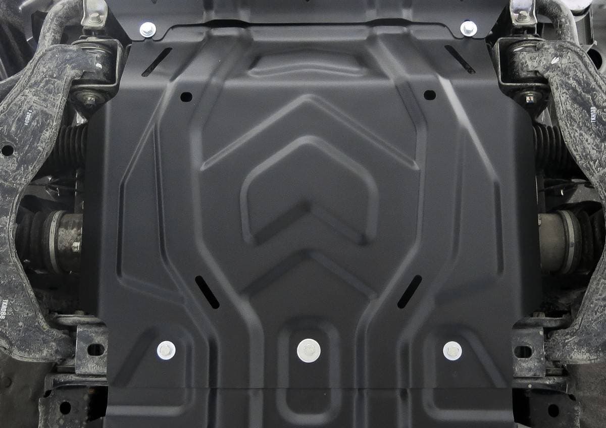 Порошковое окрашивание гарантирует долгий срок службы. А глубокий штамп увеличивает жесткость до 2,5 раз. Также имеется утопленный крепеж для предотвращения срывов. Качественная покраска защиты картера выдерживает 720 часов соляного тумана. Толщина изделия составляет 2-6 мм. Подштамповка в местах крепления предохраняет крепеж от срезания. Деталь спроектирована индивидуально для вашего автомобиля, что позволяет устанавливать ее в штатные места без доработки кузова за 10 мин.