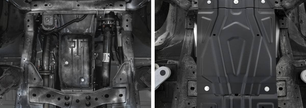 Порошковое окрашивание гарантирует долгий срок службы. А глубокий штамп увеличивает жесткость до 2,5 раз. Также имеется утопленный крепеж для предотвращения срывов. Качественная покраска защиты картера выдерживает 720 часов соляного тумана. Толщина изделия составляет 2-6 мм. Подштамповка в местах крепления предохраняет крепеж от срезания. Деталь спроектирована индивидуально для вашего автомобиля, что позволяет устанавливать ее в штатные места без доработки кузова за 10 мин.