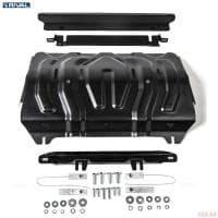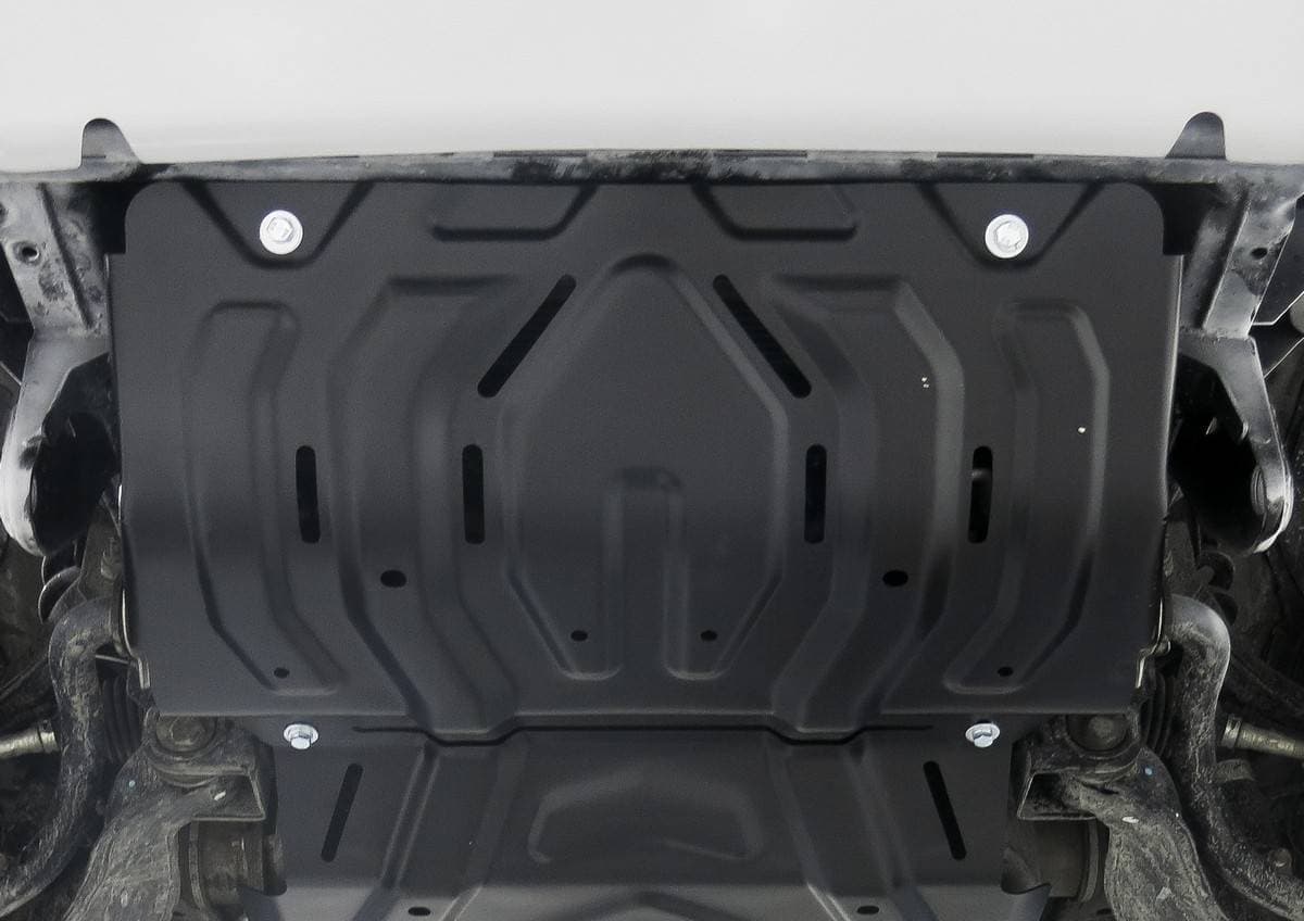 Порошковое окрашивание гарантирует долгий срок службы. А глубокий штамп увеличивает жесткость до 2,5 раз. Также имеется утопленный крепеж для предотвращения срывов. Качественная покраска защиты картера выдерживает 720 часов соляного тумана. Толщина изделия составляет 2-6 мм. Подштамповка в местах крепления предохраняет крепеж от срезания. Деталь спроектирована индивидуально для вашего автомобиля, что позволяет устанавливать ее в штатные места без доработки кузова за 10 мин.