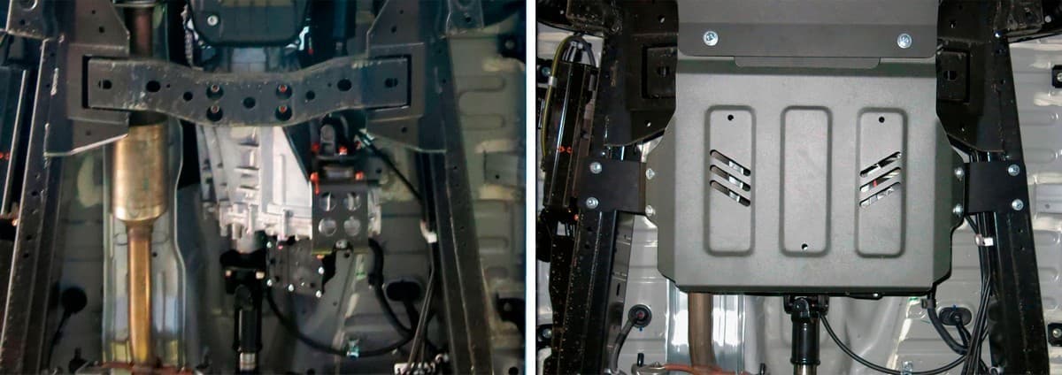 Стойкое порошковое окрашивание позволяет сохранить внешний вид, защитит от царапин, предотвратит коррозию. Также имеется утопленный крепеж для предотвращения срывов. Крепеж не образует с алюминием гальваническую пару. Защита спроектирована индивидуально для автомобиля, что позволяет устанавливать ее в штатные места без доработки кузова за 10 мин.