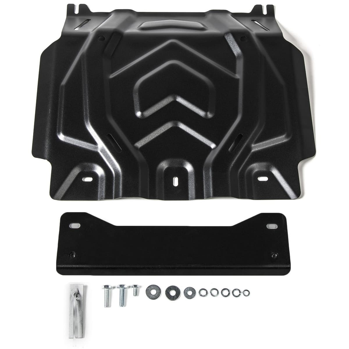 Порошковое окрашивание гарантирует долгий срок службы. А глубокий штамп увеличивает жесткость до 2,5 раз. Также имеется утопленный крепеж для предотвращения срывов. Качественная покраска защиты картера выдерживает 720 часов соляного тумана. Толщина изделия составляет 2-6 мм. Подштамповка в местах крепления предохраняет крепеж от срезания. Деталь спроектирована индивидуально для вашего автомобиля, что позволяет устанавливать ее в штатные места без доработки кузова за 10 мин.