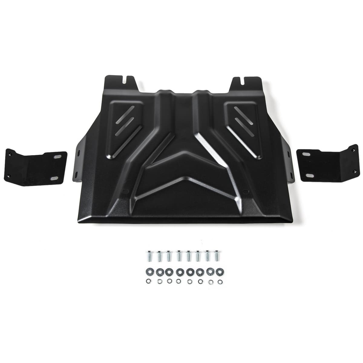 Порошковое окрашивание гарантирует долгий срок службы. А глубокий штамп увеличивает жесткость до 2,5 раз. Также имеется утопленный крепеж для предотвращения срывов. Качественная покраска защиты картера выдерживает 720 часов соляного тумана. Толщина изделия составляет 2-6 мм. Подштамповка в местах крепления предохраняет крепеж от срезания. Деталь спроектирована индивидуально для вашего автомобиля, что позволяет устанавливать ее в штатные места без доработки кузова за 10 мин.