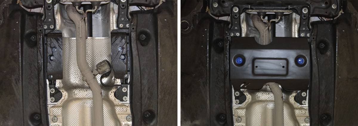 Порошковое окрашивание гарантирует долгий срок службы. А глубокий штамп увеличивает жесткость до 2,5 раз. Также имеется утопленный крепеж для предотвращения срывов. Качественная покраска защиты картера выдерживает 720 часов соляного тумана. Толщина изделия составляет 2-6 мм. Подштамповка в местах крепления предохраняет крепеж от срезания. Деталь спроектирована индивидуально для вашего автомобиля, что позволяет устанавливать ее в штатные места без доработки кузова за 10 мин.