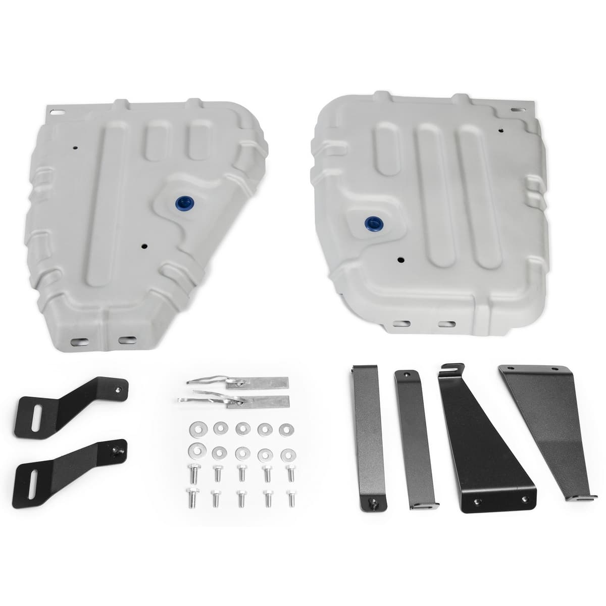 Стойкое порошковое окрашивание позволяет сохранить внешний вид, защитит от царапин, предотвратит коррозию. Также имеется утопленный крепеж для предотвращения срывов. Крепеж не образует с алюминием гальваническую пару. Защита спроектирована индивидуально для автомобиля, что позволяет устанавливать ее в штатные места без доработки кузова за 10 мин.