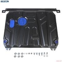 Порошковое окрашивание гарантирует долгий срок службы. А глубокий штамп увеличивает жесткость до 2,5 раз. Также имеется утопленный крепеж для предотвращения срывов. Качественная покраска защиты картера выдерживает 720 часов соляного тумана. Толщина изделия составляет 2-6 мм. Подштамповка в местах крепления предохраняет крепеж от срезания. Деталь спроектирована индивидуально для вашего автомобиля, что позволяет устанавливать ее в штатные места без доработки кузова за 10 мин.