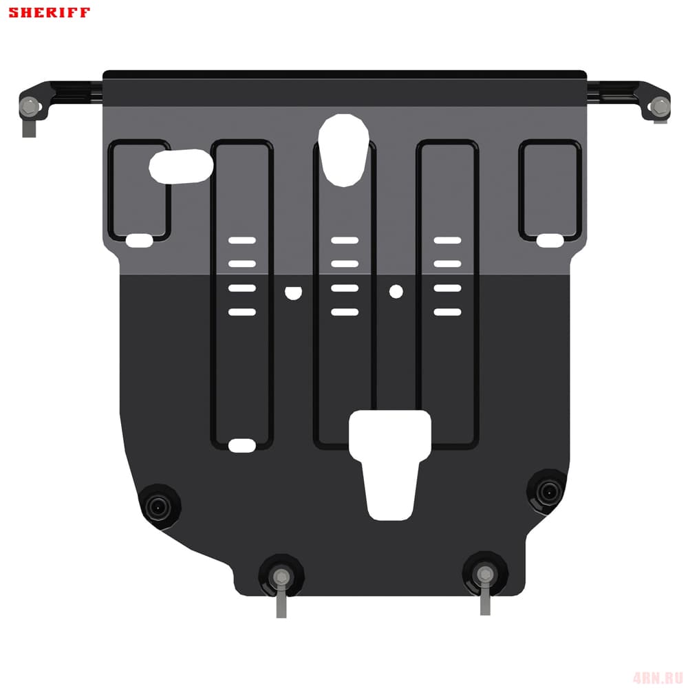 Защита картера Sheriff нужна для сохранности узлов и агрегатов, находящихся на днище авто. Она надежно защитит двигательный отсек вашей машины от повреждений. Также она защищает моторный отсек от влаги, грязи, и предусматривает наличие металлических крыльев, которые выполняют функцию пыльника.