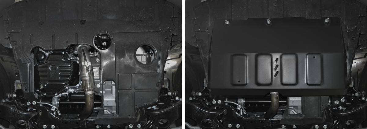 Порошковое окрашивание гарантирует долгий срок службы. А глубокий штамп увеличивает жесткость до 2,5 раз. Также имеется утопленный крепеж для предотвращения срывов. Качественная покраска защиты картера выдерживает 720 часов соляного тумана. Толщина изделия составляет 2-6 мм. Подштамповка в местах крепления предохраняет крепеж от срезания. Деталь спроектирована индивидуально для вашего автомобиля, что позволяет устанавливать ее в штатные места без доработки кузова за 10 мин.