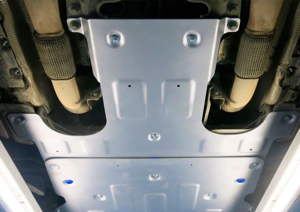 Стойкое порошковое окрашивание позволяет сохранить внешний вид, защитит от царапин, предотвратит коррозию. Также имеется утопленный крепеж для предотвращения срывов. Крепеж не образует с алюминием гальваническую пару. Защита спроектирована индивидуально для автомобиля, что позволяет устанавливать ее в штатные места без доработки кузова за 10 мин.