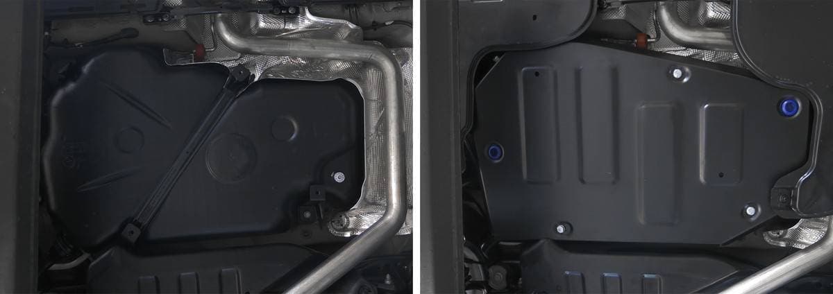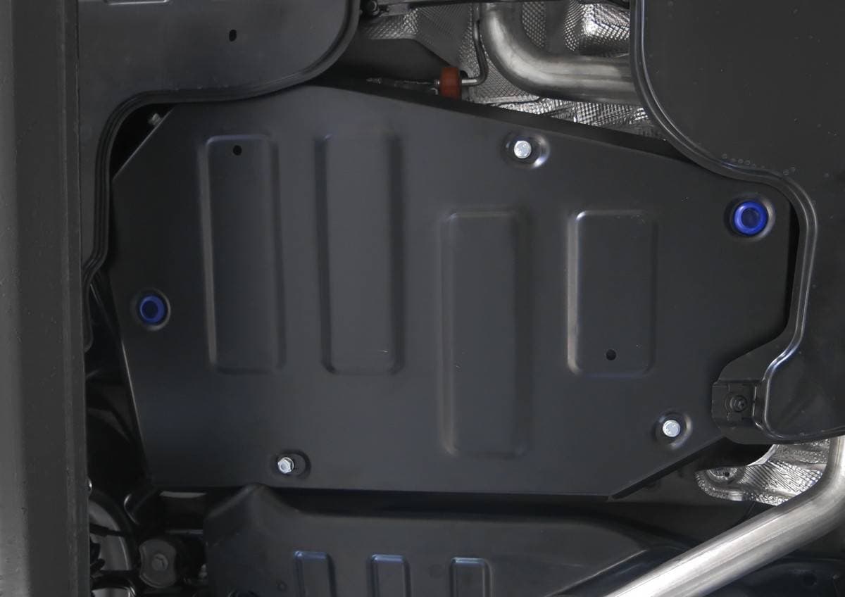 Порошковое окрашивание гарантирует долгий срок службы. А глубокий штамп увеличивает жесткость до 2,5 раз. Также имеется утопленный крепеж для предотвращения срывов. Качественная покраска защиты картера выдерживает 720 часов соляного тумана. Толщина изделия составляет 2-6 мм. Подштамповка в местах крепления предохраняет крепеж от срезания. Деталь спроектирована индивидуально для вашего автомобиля, что позволяет устанавливать ее в штатные места без доработки кузова за 10 мин.