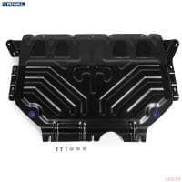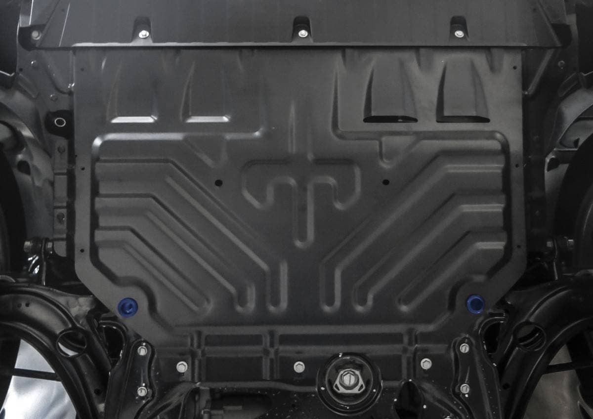 Порошковое окрашивание гарантирует долгий срок службы. А глубокий штамп увеличивает жесткость до 2,5 раз. Также имеется утопленный крепеж для предотвращения срывов. Качественная покраска защиты картера выдерживает 720 часов соляного тумана. Толщина изделия составляет 2-6 мм. Подштамповка в местах крепления предохраняет крепеж от срезания. Деталь спроектирована индивидуально для вашего автомобиля, что позволяет устанавливать ее в штатные места без доработки кузова за 10 мин.