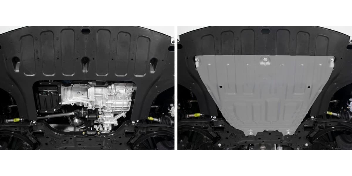Защита картера и КПП артикул № AM333.2370.1 от российского производителя AutoMax. Разработана специально для авто Kia Rio IV (вкл. X-Line) (2017-2021).