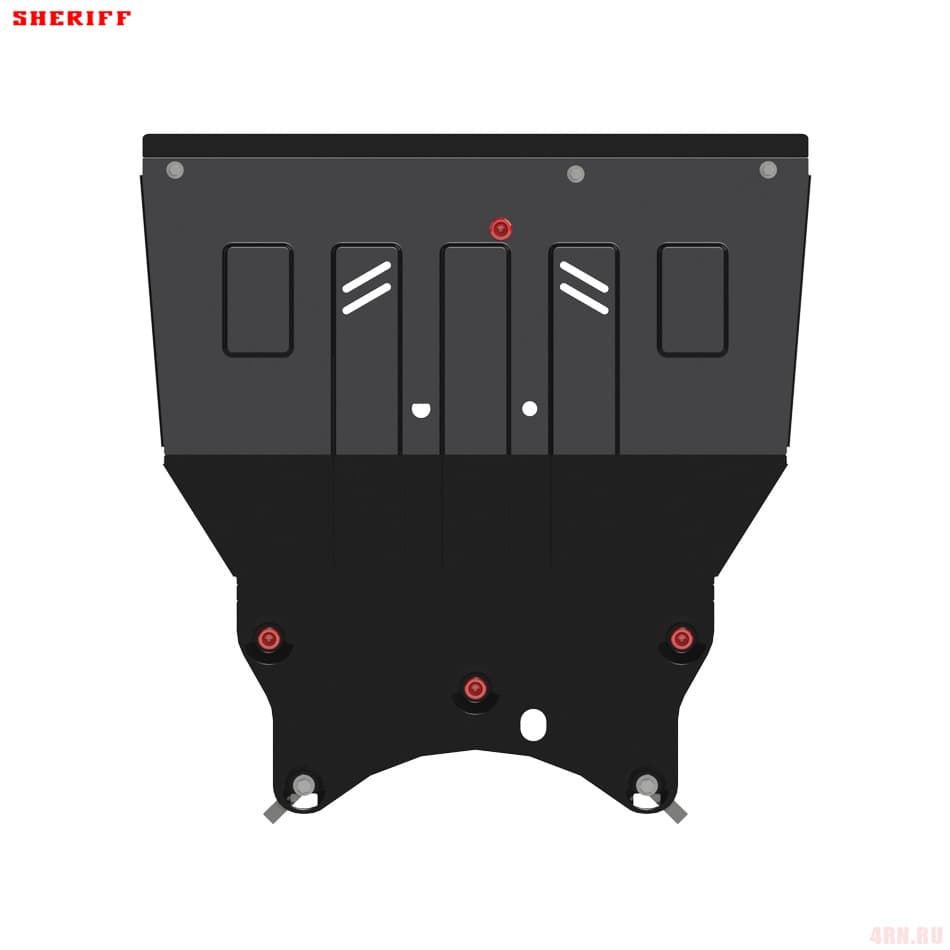 Защита картера Sheriff нужна для сохранности узлов и агрегатов, находящихся на днище авто. Она надежно защитит двигательный отсек вашей машины от повреждений. Также она защищает моторный отсек от влаги, грязи, и предусматривает наличие металлических крыльев, которые выполняют функцию пыльника.