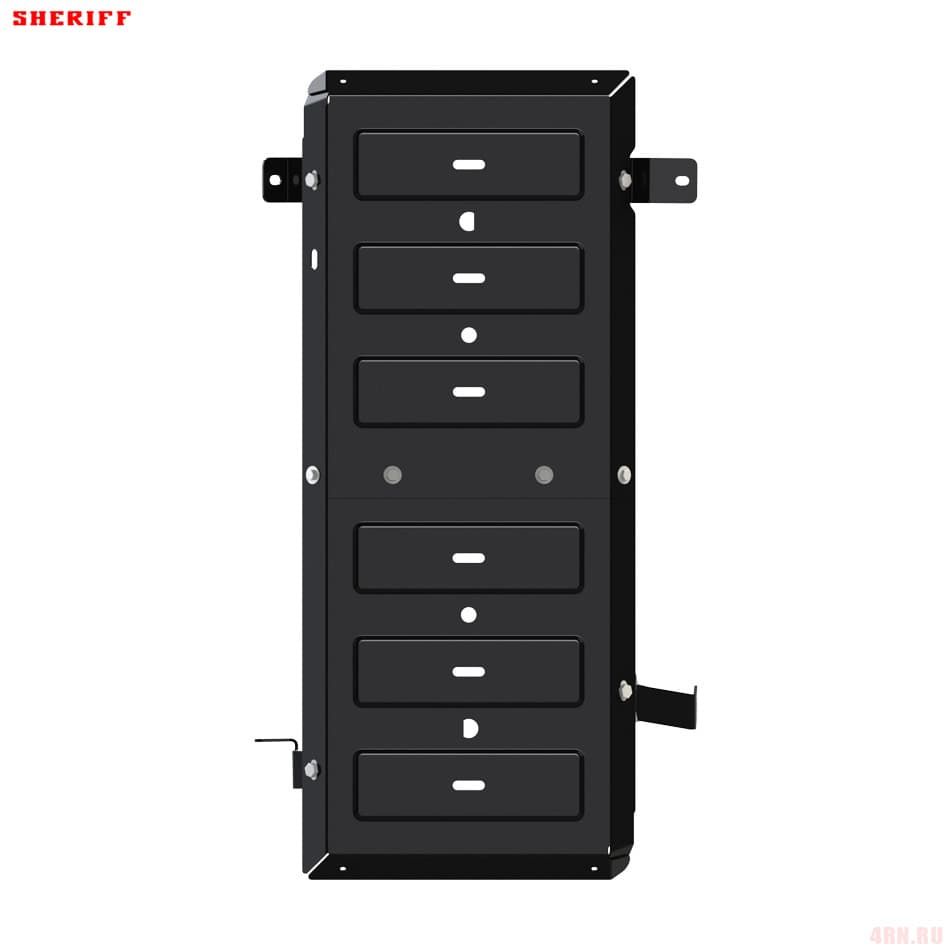 Защита картера Sheriff нужна для сохранности узлов и агрегатов, находящихся на днище авто. Она надежно защитит двигательный отсек вашей машины от повреждений. Также она защищает моторный отсек от влаги, грязи, и предусматривает наличие металлических крыльев, которые выполняют функцию пыльника.