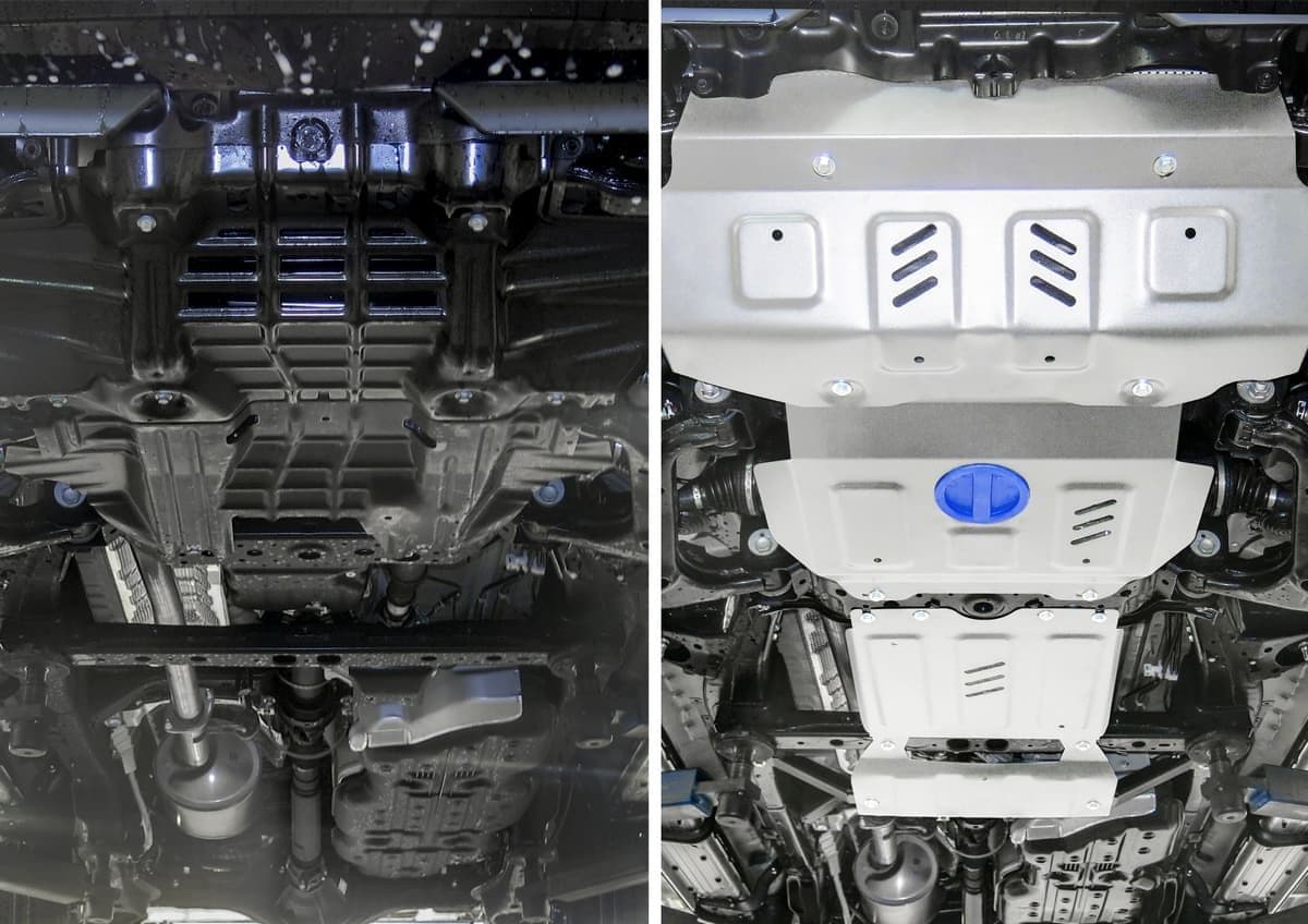 Стойкое порошковое окрашивание позволяет сохранить внешний вид, защитит от царапин, предотвратит коррозию. Также имеется утопленный крепеж для предотвращения срывов. Крепеж не образует с алюминием гальваническую пару. Защита спроектирована индивидуально для автомобиля, что позволяет устанавливать ее в штатные места без доработки кузова за 10 мин.