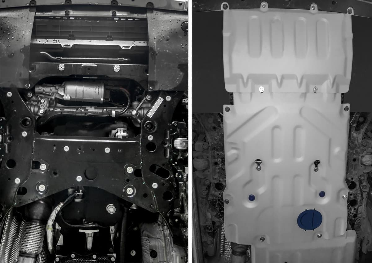 Стойкое порошковое окрашивание позволяет сохранить внешний вид, защитит от царапин, предотвратит коррозию. Также имеется утопленный крепеж для предотвращения срывов. Крепеж не образует с алюминием гальваническую пару. Защита спроектирована индивидуально для автомобиля, что позволяет устанавливать ее в штатные места без доработки кузова за 10 мин.
