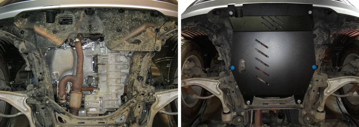 Порошковое окрашивание гарантирует долгий срок службы. А глубокий штамп увеличивает жесткость до 2,5 раз. Также имеется утопленный крепеж для предотвращения срывов. Качественная покраска защиты картера выдерживает 720 часов соляного тумана. Толщина изделия составляет 2-6 мм. Подштамповка в местах крепления предохраняет крепеж от срезания. Деталь спроектирована индивидуально для вашего автомобиля, что позволяет устанавливать ее в штатные места без доработки кузова за 10 мин.