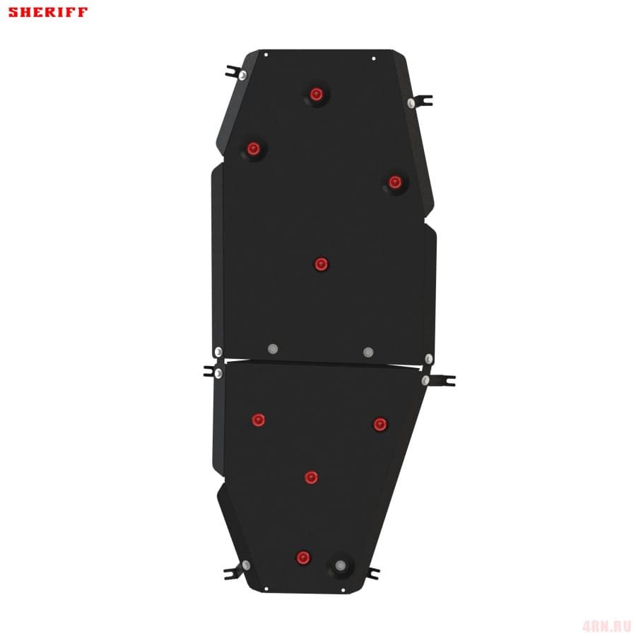 Защита картера Sheriff нужна для сохранности узлов и агрегатов, находящихся на днище авто. Она надежно защитит двигательный отсек вашей машины от повреждений. Также она защищает моторный отсек от влаги, грязи, и предусматривает наличие металлических крыльев, которые выполняют функцию пыльника.
