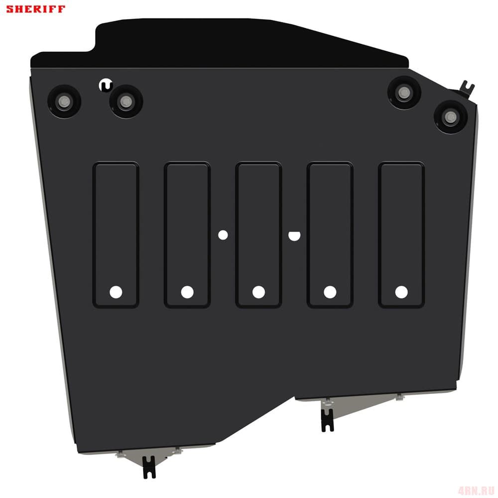 Защита картера Sheriff нужна для сохранности узлов и агрегатов, находящихся на днище авто. Она надежно защитит двигательный отсек вашей машины от повреждений. Также она защищает моторный отсек от влаги, грязи, и предусматривает наличие металлических крыльев, которые выполняют функцию пыльника.