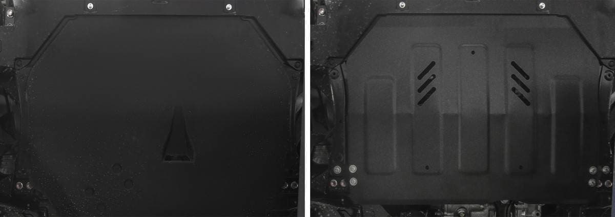 Порошковое окрашивание гарантирует долгий срок службы. А глубокий штамп увеличивает жесткость до 2,5 раз. Также имеется утопленный крепеж для предотвращения срывов. Качественная покраска защиты картера выдерживает 720 часов соляного тумана. Толщина изделия составляет 2-6 мм. Подштамповка в местах крепления предохраняет крепеж от срезания. Деталь спроектирована индивидуально для вашего автомобиля, что позволяет устанавливать ее в штатные места без доработки кузова за 10 мин.