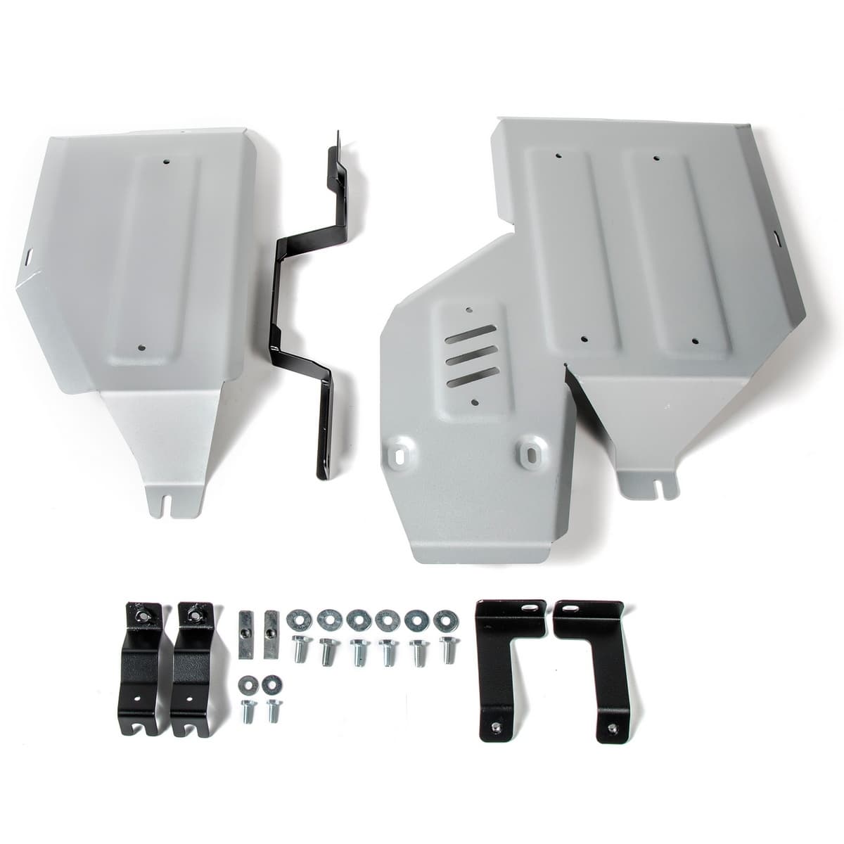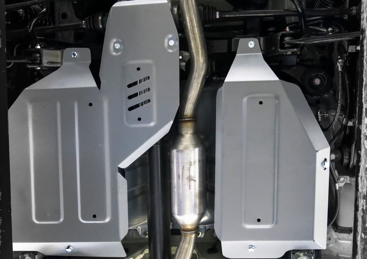 Стойкое порошковое окрашивание позволяет сохранить внешний вид, защитит от царапин, предотвратит коррозию. Также имеется утопленный крепеж для предотвращения срывов. Крепеж не образует с алюминием гальваническую пару. Защита спроектирована индивидуально для автомобиля, что позволяет устанавливать ее в штатные места без доработки кузова за 10 мин.