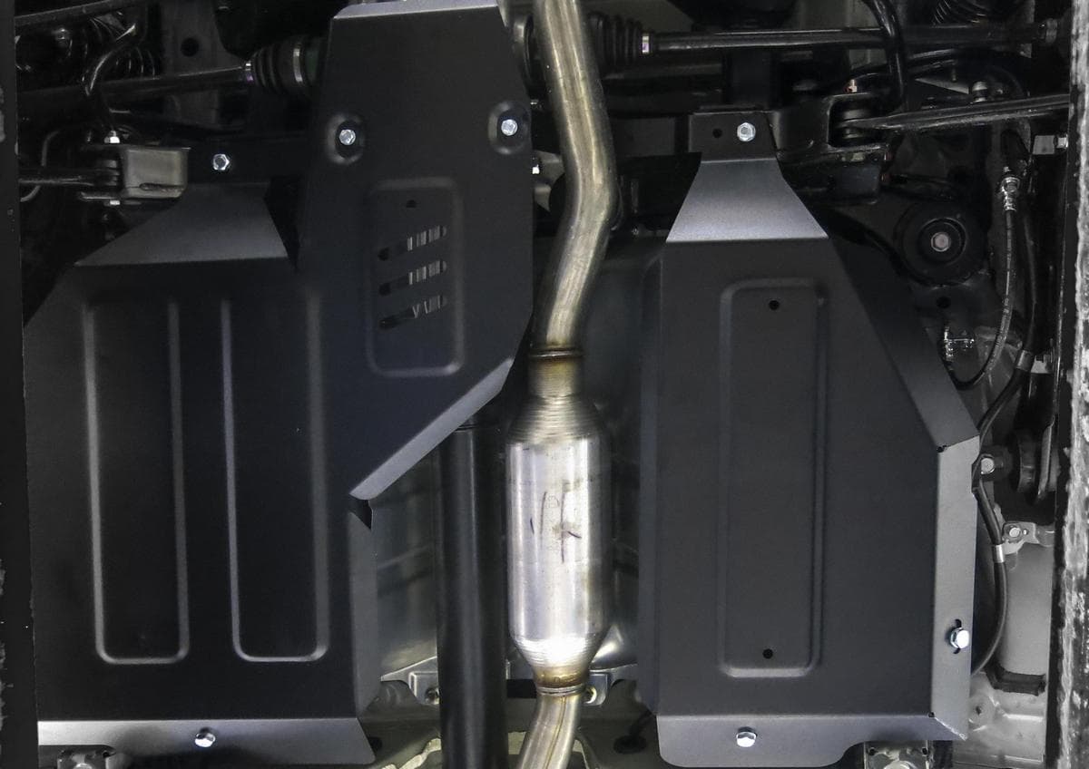 Порошковое окрашивание гарантирует долгий срок службы. А глубокий штамп увеличивает жесткость до 2,5 раз. Также имеется утопленный крепеж для предотвращения срывов. Качественная покраска защиты картера выдерживает 720 часов соляного тумана. Толщина изделия составляет 2-6 мм. Подштамповка в местах крепления предохраняет крепеж от срезания. Деталь спроектирована индивидуально для вашего автомобиля, что позволяет устанавливать ее в штатные места без доработки кузова за 10 мин.