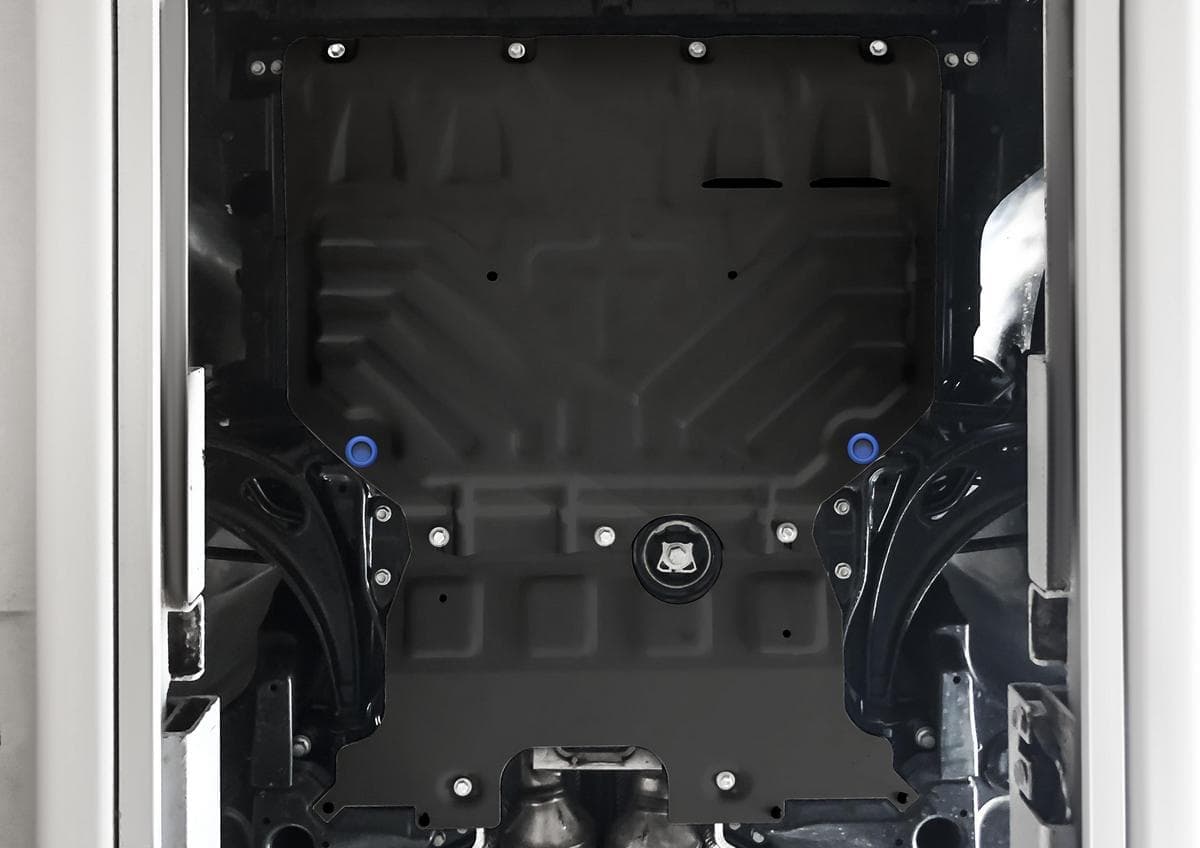 Порошковое окрашивание гарантирует долгий срок службы. А глубокий штамп увеличивает жесткость до 2,5 раз. Также имеется утопленный крепеж для предотвращения срывов. Качественная покраска защиты картера выдерживает 720 часов соляного тумана. Толщина изделия составляет 2-6 мм. Подштамповка в местах крепления предохраняет крепеж от срезания. Деталь спроектирована индивидуально для вашего автомобиля, что позволяет устанавливать ее в штатные места без доработки кузова за 10 мин.
