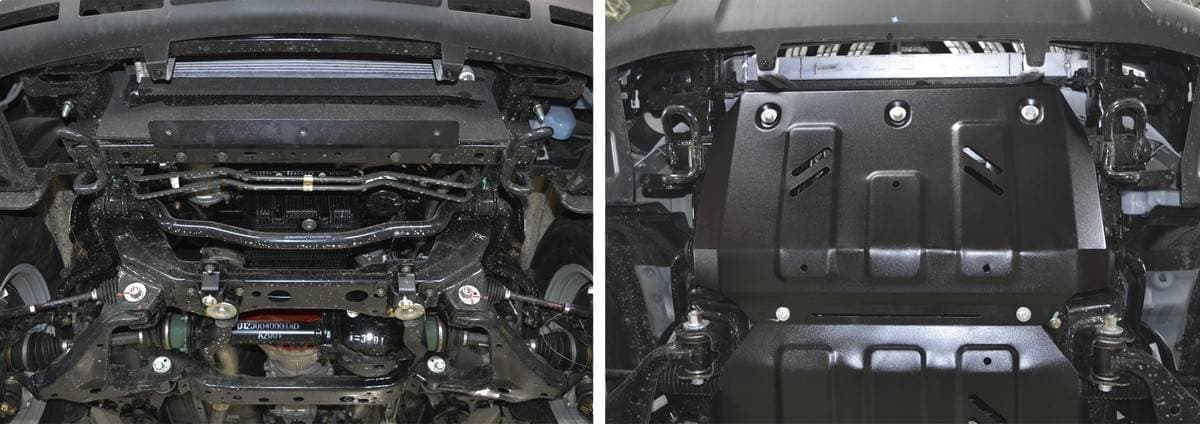 Порошковое окрашивание гарантирует долгий срок службы. А глубокий штамп увеличивает жесткость до 2,5 раз. Также имеется утопленный крепеж для предотвращения срывов. Качественная покраска защиты картера выдерживает 720 часов соляного тумана. Толщина изделия составляет 2-6 мм. Подштамповка в местах крепления предохраняет крепеж от срезания. Деталь спроектирована индивидуально для вашего автомобиля, что позволяет устанавливать ее в штатные места без доработки кузова за 10 мин.