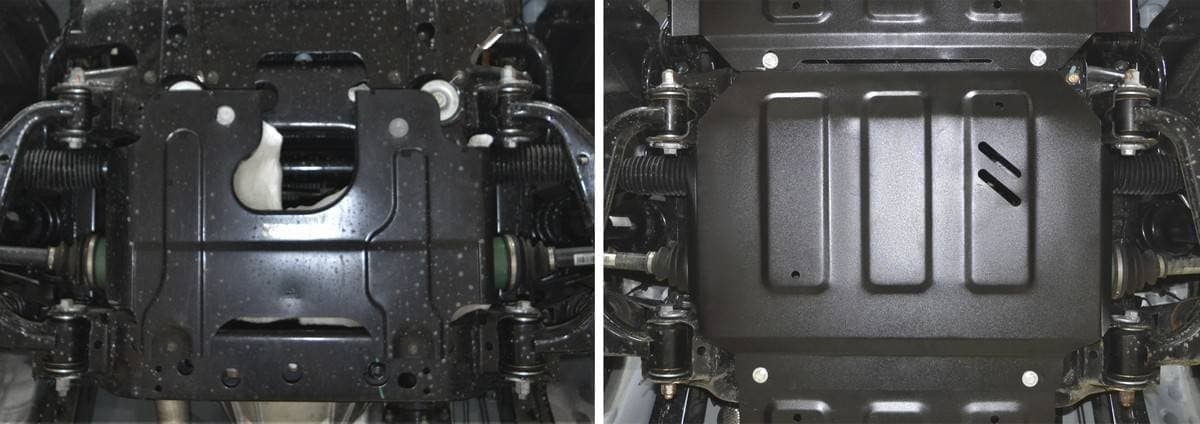 Порошковое окрашивание гарантирует долгий срок службы. А глубокий штамп увеличивает жесткость до 2,5 раз. Также имеется утопленный крепеж для предотвращения срывов. Качественная покраска защиты картера выдерживает 720 часов соляного тумана. Толщина изделия составляет 2-6 мм. Подштамповка в местах крепления предохраняет крепеж от срезания. Деталь спроектирована индивидуально для вашего автомобиля, что позволяет устанавливать ее в штатные места без доработки кузова за 10 мин.