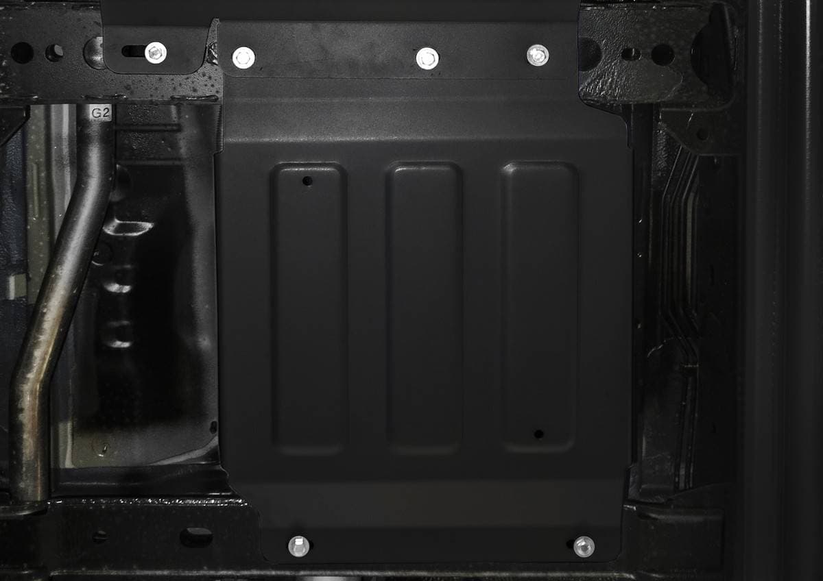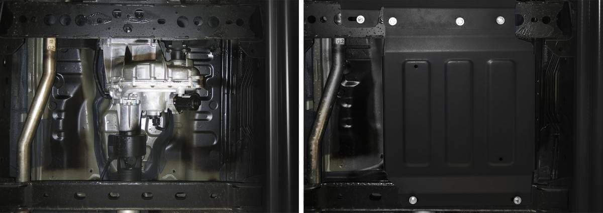 Порошковое окрашивание гарантирует долгий срок службы. А глубокий штамп увеличивает жесткость до 2,5 раз. Также имеется утопленный крепеж для предотвращения срывов. Качественная покраска защиты картера выдерживает 720 часов соляного тумана. Толщина изделия составляет 2-6 мм. Подштамповка в местах крепления предохраняет крепеж от срезания. Деталь спроектирована индивидуально для вашего автомобиля, что позволяет устанавливать ее в штатные места без доработки кузова за 10 мин.