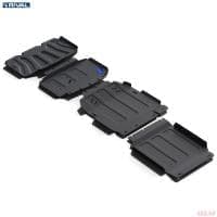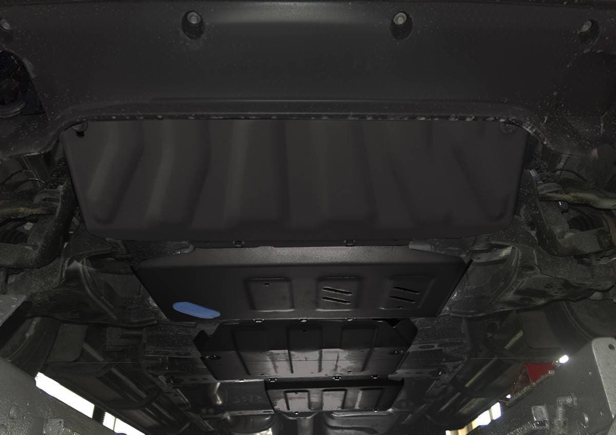 Порошковое окрашивание гарантирует долгий срок службы. А глубокий штамп увеличивает жесткость до 2,5 раз. Также имеется утопленный крепеж для предотвращения срывов. Качественная покраска защиты картера выдерживает 720 часов соляного тумана. Толщина изделия составляет 2-6 мм. Подштамповка в местах крепления предохраняет крепеж от срезания. Деталь спроектирована индивидуально для вашего автомобиля, что позволяет устанавливать ее в штатные места без доработки кузова за 10 мин.