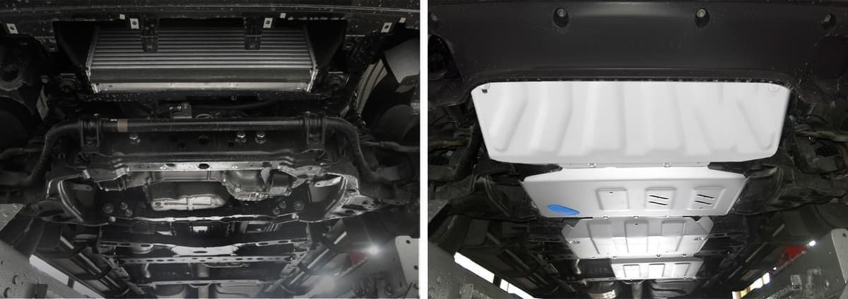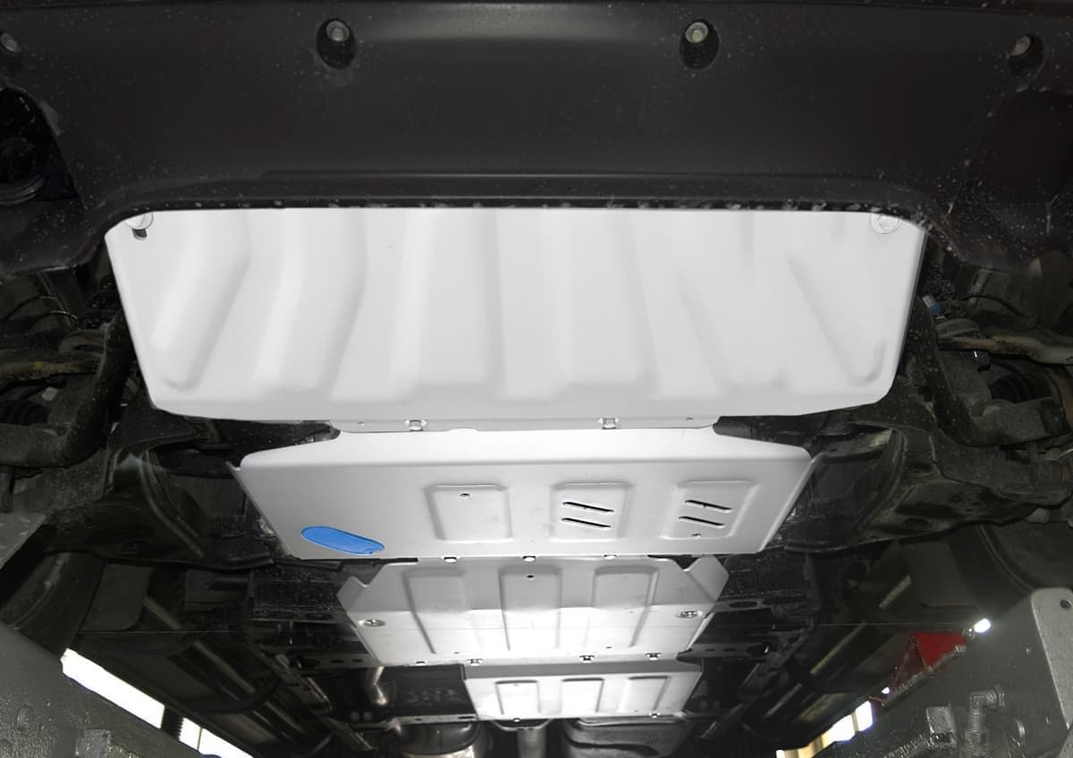Стойкое порошковое окрашивание позволяет сохранить внешний вид, защитит от царапин, предотвратит коррозию. Также имеется утопленный крепеж для предотвращения срывов. Крепеж не образует с алюминием гальваническую пару. Защита спроектирована индивидуально для автомобиля, что позволяет устанавливать ее в штатные места без доработки кузова за 10 мин.