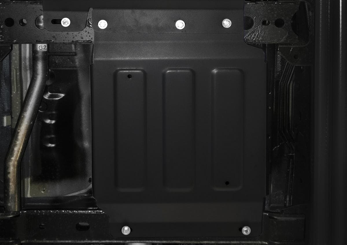 Порошковое окрашивание гарантирует долгий срок службы. А глубокий штамп увеличивает жесткость до 2,5 раз. Также имеется утопленный крепеж для предотвращения срывов. Качественная покраска защиты картера выдерживает 720 часов соляного тумана. Толщина изделия составляет 2-6 мм. Подштамповка в местах крепления предохраняет крепеж от срезания. Деталь спроектирована индивидуально для вашего автомобиля, что позволяет устанавливать ее в штатные места без доработки кузова за 10 мин.