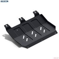 Порошковое окрашивание гарантирует долгий срок службы. А глубокий штамп увеличивает жесткость до 2,5 раз. Также имеется утопленный крепеж для предотвращения срывов. Качественная покраска защиты картера выдерживает 720 часов соляного тумана. Толщина изделия составляет 2-6 мм. Подштамповка в местах крепления предохраняет крепеж от срезания. Деталь спроектирована индивидуально для вашего автомобиля, что позволяет устанавливать ее в штатные места без доработки кузова за 10 мин.