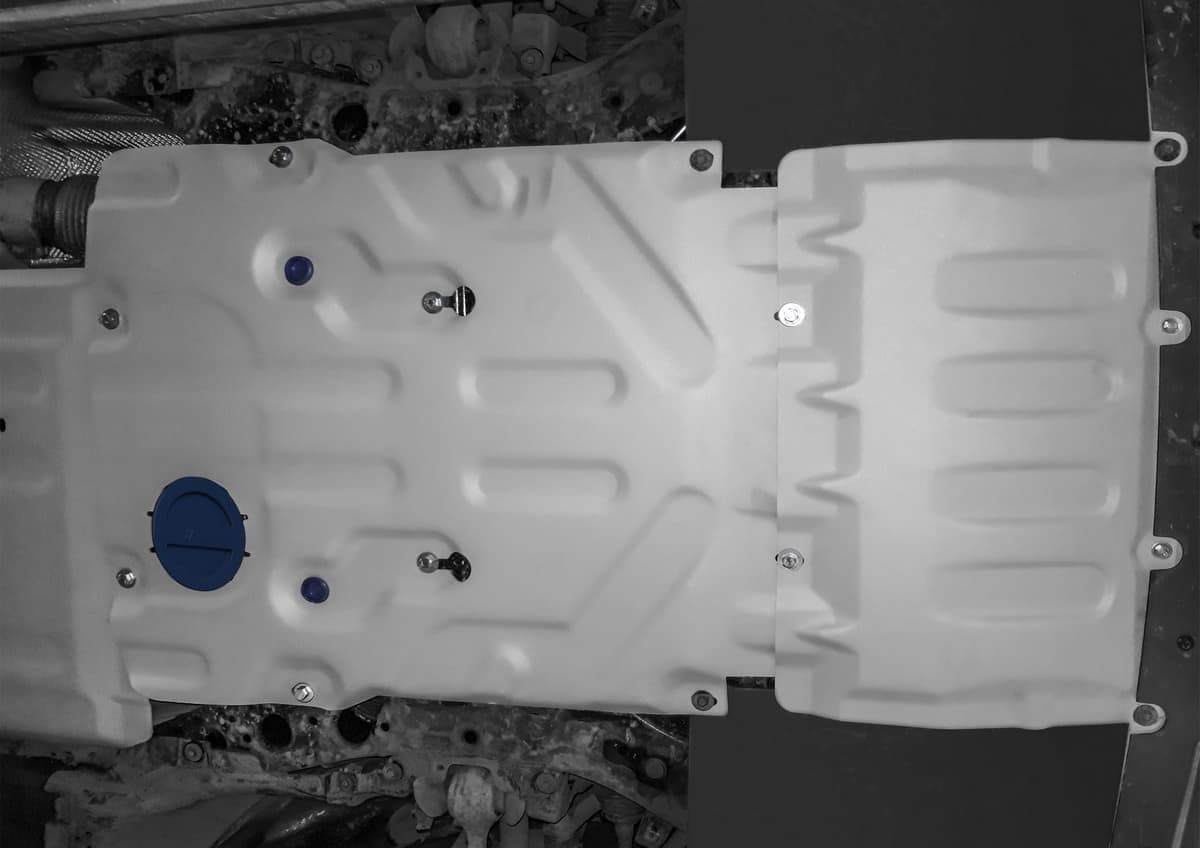 Стойкое порошковое окрашивание позволяет сохранить внешний вид, защитит от царапин, предотвратит коррозию. Также имеется утопленный крепеж для предотвращения срывов. Крепеж не образует с алюминием гальваническую пару. Защита спроектирована индивидуально для автомобиля, что позволяет устанавливать ее в штатные места без доработки кузова за 10 мин.