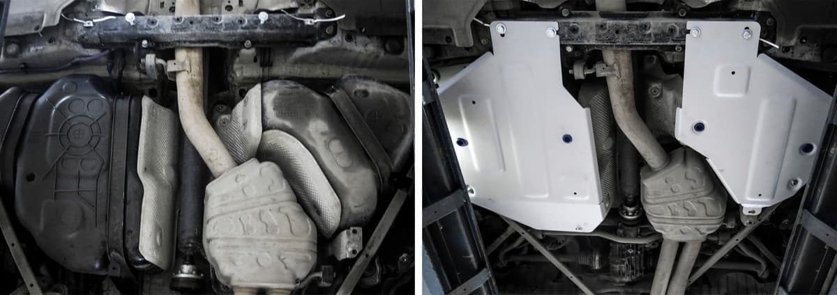 Стойкое порошковое окрашивание позволяет сохранить внешний вид, защитит от царапин, предотвратит коррозию. Также имеется утопленный крепеж для предотвращения срывов. Крепеж не образует с алюминием гальваническую пару. Защита спроектирована индивидуально для автомобиля, что позволяет устанавливать ее в штатные места без доработки кузова за 10 мин.
