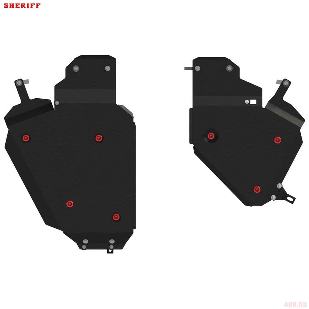 Защита картера Sheriff нужна для сохранности узлов и агрегатов, находящихся на днище авто. Она надежно защитит двигательный отсек вашей машины от повреждений. Также она защищает моторный отсек от влаги, грязи, и предусматривает наличие металлических крыльев, которые выполняют функцию пыльника.